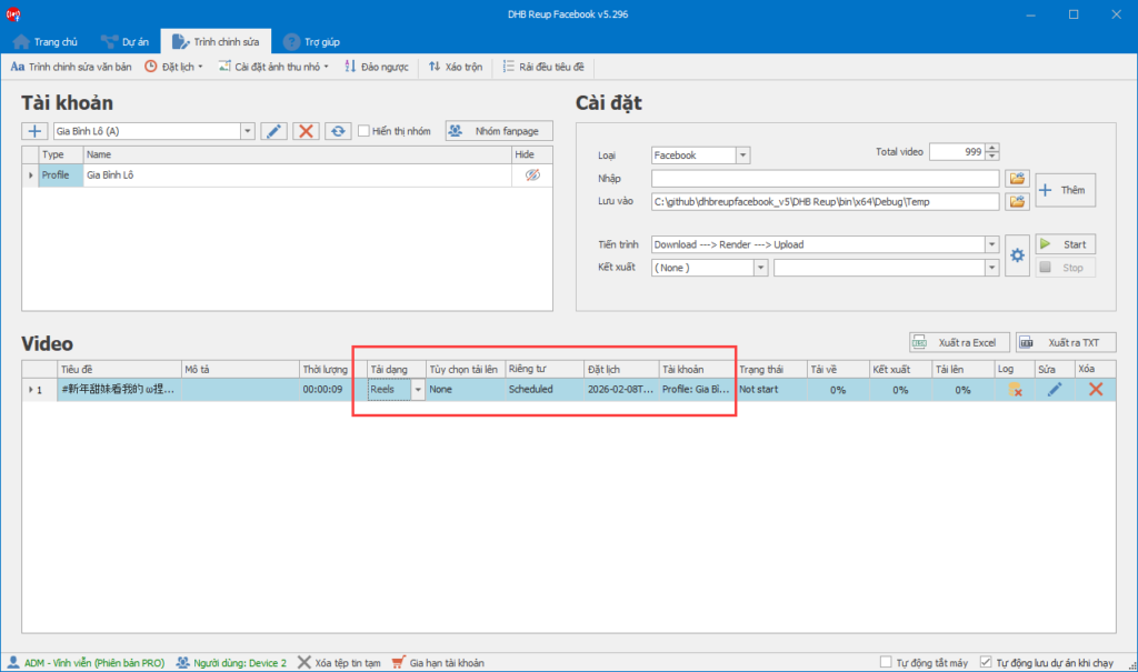 Nếu bạn đang sử dụng phần mềm DHB Reup Facebook, sau đây là cách thiết lập để đăng Reels lên Profile và đặt lịch công khai.